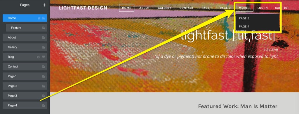 As the number of pages you add outgrows the space on your navigation bar, additional pages will automatically be categorized under a tab labeled More.