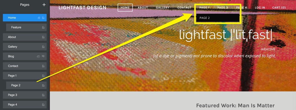The navigation menu will show your main pages, and when you hover over them, your sub-pages will appear in a drop-down menu below them.