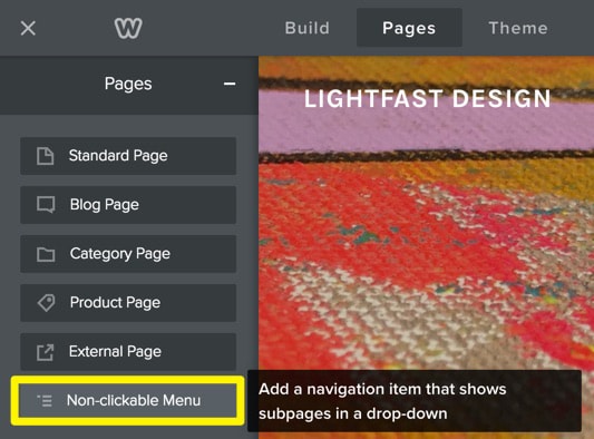 Your main menu item can be either a functional link leading to a page, or a non-clickable menu item that will only display the subpages instead. To create a nonclickable menu, add a new page from the Pages tab and choose the Nonclickable Menu option. When you're done, you can arrange your subpages under your new nonclickable menu.