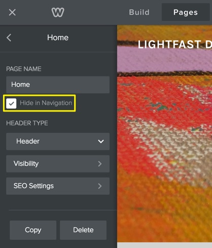 To a hide a page from the navigation menu, open the Pages list by selecting the Pages tab, choose the page and check the “Hide in Navigation” box.