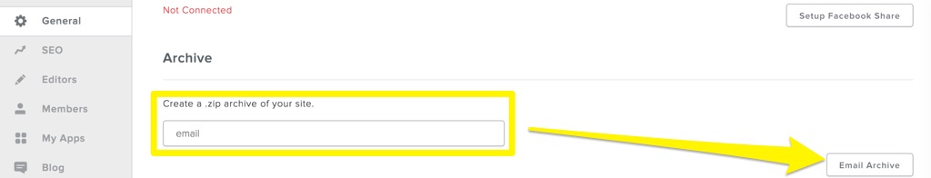 Log into the site editor and go to Settings > General, then scroll down to the Archive section. Enter your email address in the field and select Email Archive. You’ll receive an email shortly with a link to download the archive as a ZIP file.