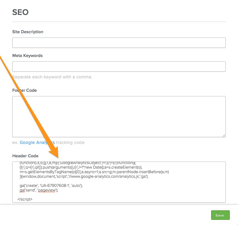 Then go to the Settings tab and select the SEO section. Paste the code into either the Header or Footer area.