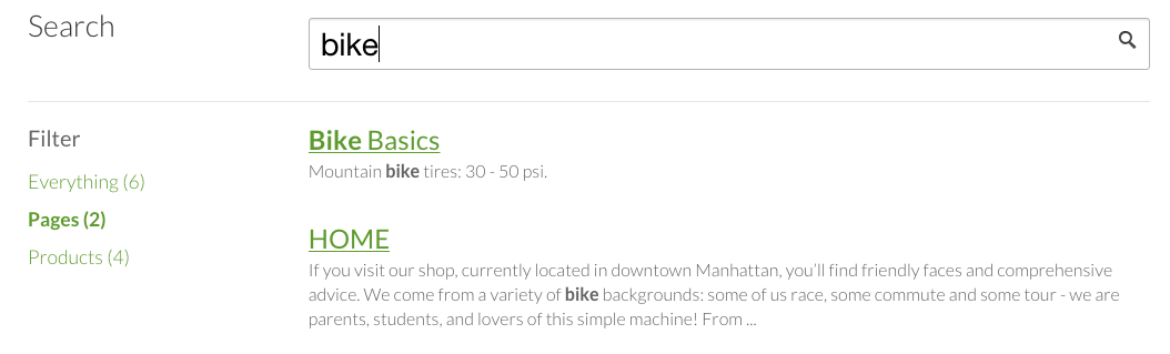 The results are immediately displayed on a search results page that distinguishes between regular pages, blog pages, and blog comments. The layout of the results page cannot be directly edited, but it uses your global font settings (found under Design > Design Options) to determine how the text should look.