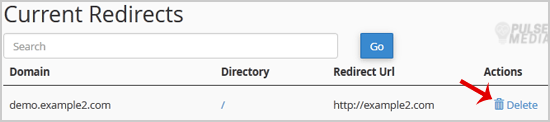 3. Scroll down to the end of the page and under Current Redirects locate the domain and click on the remove icon.