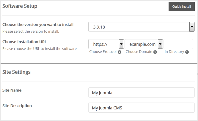 - Choose Installation URL: Choose the appropriate protocol/domain. Inside the "In Directory" field, should you want to install this in a directory, i.e. example.com/directory, enter the directory name. Otherwise, leave it blank to install in your main domain, i.e. example.com