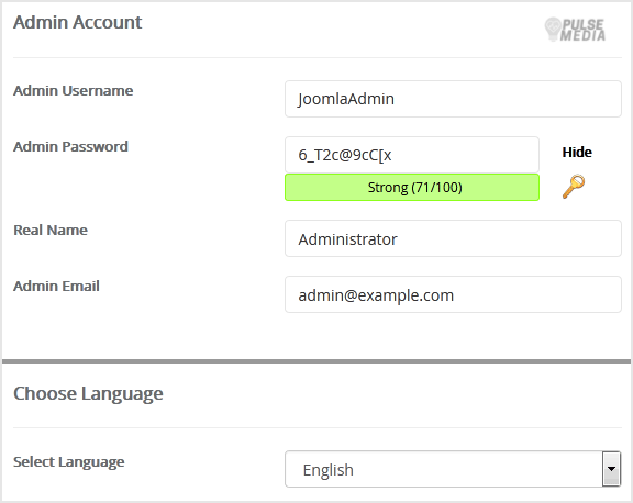 - Admin Username: Your new Joomla username (for security reason do not use the Administrator or the Admin username.)