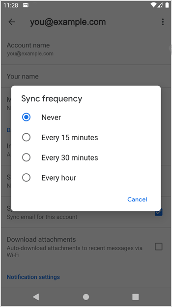 5. Set your frequency to 15 minutes or any custom time. If you do not wish to sync email automatically, set it to Never. This will require you to sync the emails manually.