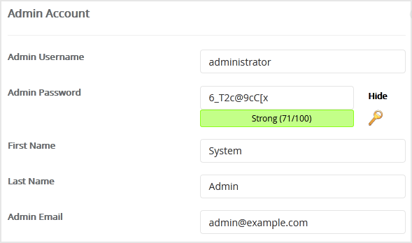 8. Under the Admin Account field, enter the following information: