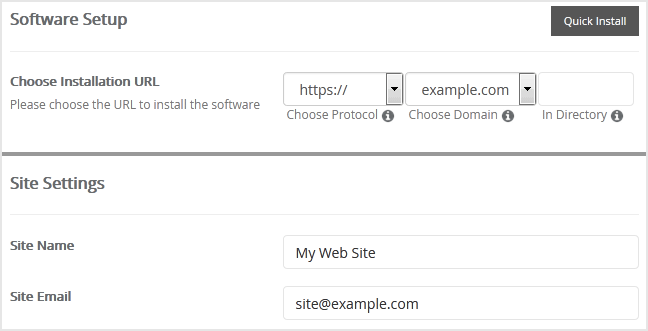 - Choose Installation URL: Choose the appropriate protocol/domain. Inside the "In Directory" field, should you want to install this in a directory, i.e. example.com/directory, enter the directory name. Otherwise, leave it blank to install in your main domain, i.e. example.com