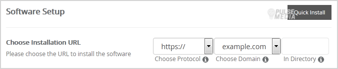 • Choose Installation URL: Choose the appropriate protocol/domain. Inside the "In Directory" field, should you want to install this in a directory, i.e., example.com/directory, enter the directory name. Otherwise, leave it blank to install in your main domain, i.e., example.com