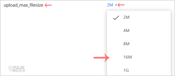4. Look for upload_max_filesize and click on the drop-down option displayed in front of it. Then choose the appropriate limit as per your requirements.