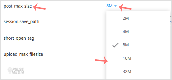 4. Look for post_max_size and click on the drop-down option displayed in front of it. Then choose the appropriate limit as per your requirements.